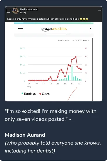 Disclaimer: The testimonials and examples used are exceptional results and are not intended to be a guarantee that you or others will achieve the same results. Individual results will vary and are dependent on your effort, business experience, knowledge, abilities, and level of implementation. This site is not a part of the Amazon website or Amazon.com Inc. Additionally, this site is NOT endorsed by Amazon in any way. Amazon is a trademark of Amazon.com, Inc. Also, we can't guarantee you won't become addicted to checking your commission notifications – that's on you.